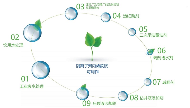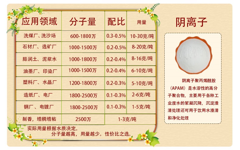 陰離子型是高聚合度合成的高分子聚合物。粘度高,分子量大,絮凝性比較強。分子中有活性基團,能改變界面狀態,與許多物質親和、 形成大的絮凝物,加速懸浮液中粒子的沉降, 有非常明顯的加快溶液澄清,促進過濾等效果。